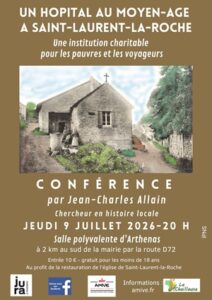 Au XIVᵉ siècle, Marguerite de Vienne, veuve du seigneur de Saint Laurent la Roche, fonda un hôpital destiné à accueillir pauvres et voyageurs. Il ne subsiste de cet établissement que la chapelle et son histoire est largement méconnue. Jean Charles Allain nous propose de redonner vie à cette institution disparue en retraçant son rôle, son organisation et son évolution au fil des siècles jusqu’à la Révolution. Une plongée passionnante dans la charité médiévale et la mémoire du village.